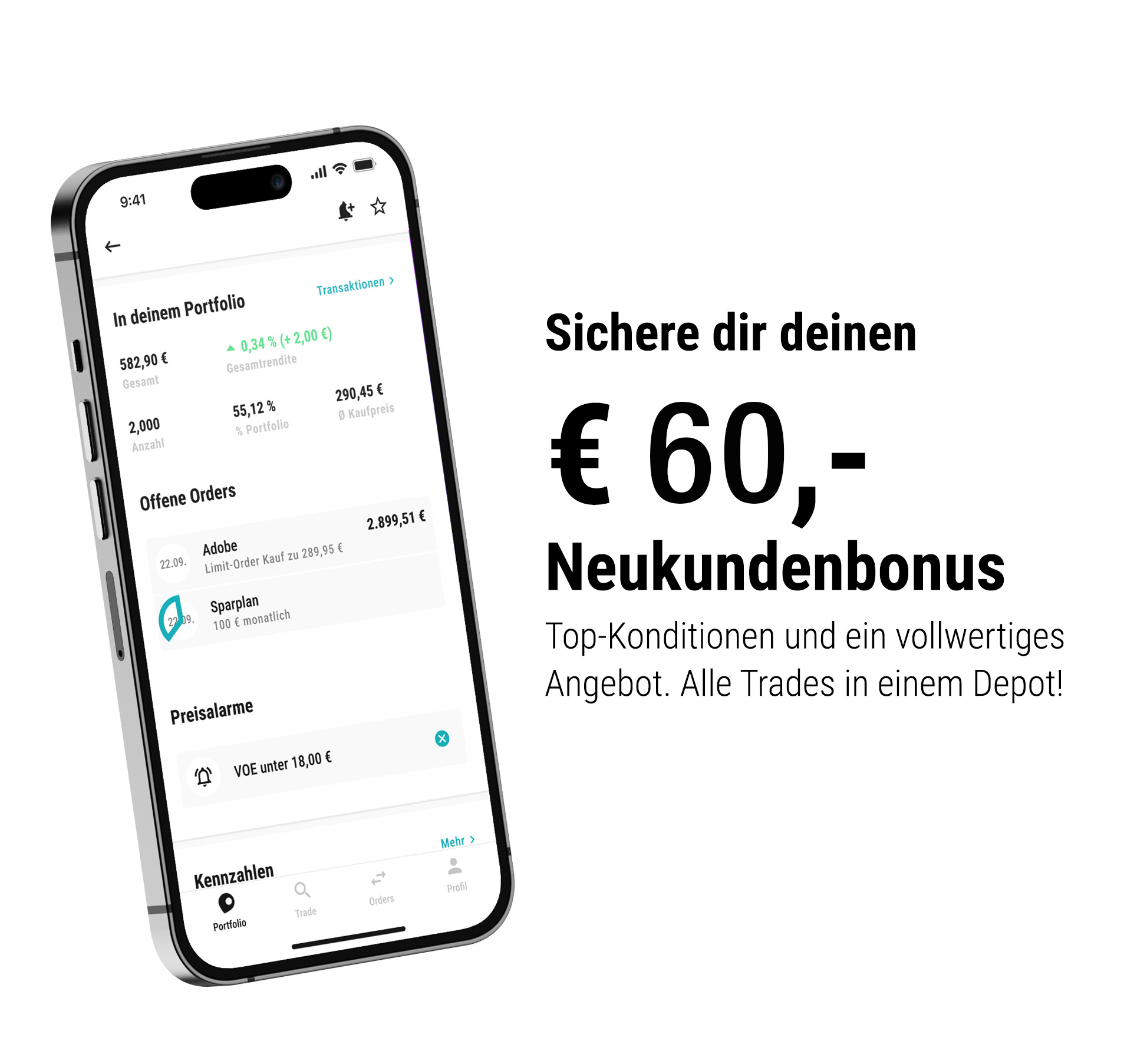 Eröffne jetzt dein Depot beim Testsieger und sichere dir € 60,- zusätzlich als Bonus in Form von Anteilen des Xtrackers II EUR Overnight Rate Swap UCITS ETF. Es gelten die Teilnahmebedingungen